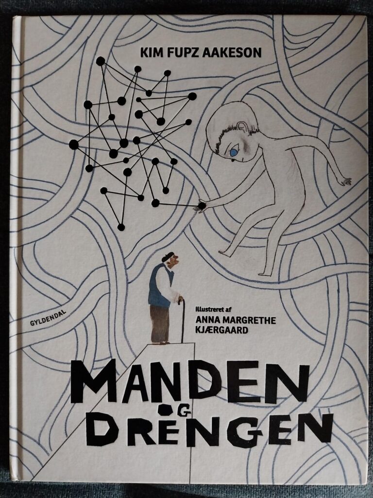 Bogen er fint illustreret af Anne Margrethe Kjærgaard og det klæder historien, at farvepaletten er holdt i sorte, grå og blå toner med abstrakte streger og mønstre, som underbygger Mandens drømmeagtige vandring ind i dødsriget. Manden fremstår som en hyggelig gammel bedstefar, men drengen er uhyggelig – også selvom han er tegnet uden sort kappe og le. Måske er det de blå øjne, måske den naivistiske tegnestil, måske blot nøgenheden, der gør det. De blå pupilløse øjne har nogenlunde samme effekt som medlemmerne af ’De dødes hær’ i HBO’s Game of Thrones serie – jobbeskrivelsen er jo også næsten den samme. Man skal ikke være et særligt frygtsomt barn for at blive holdt vågen ved puttetid af drengens isblå blik.
